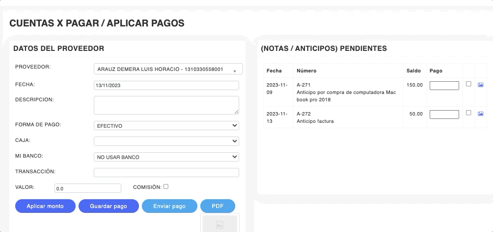 - Detalla el valor del anticipo en la casilla PAGO, ya que puede ser el total o un valor menor