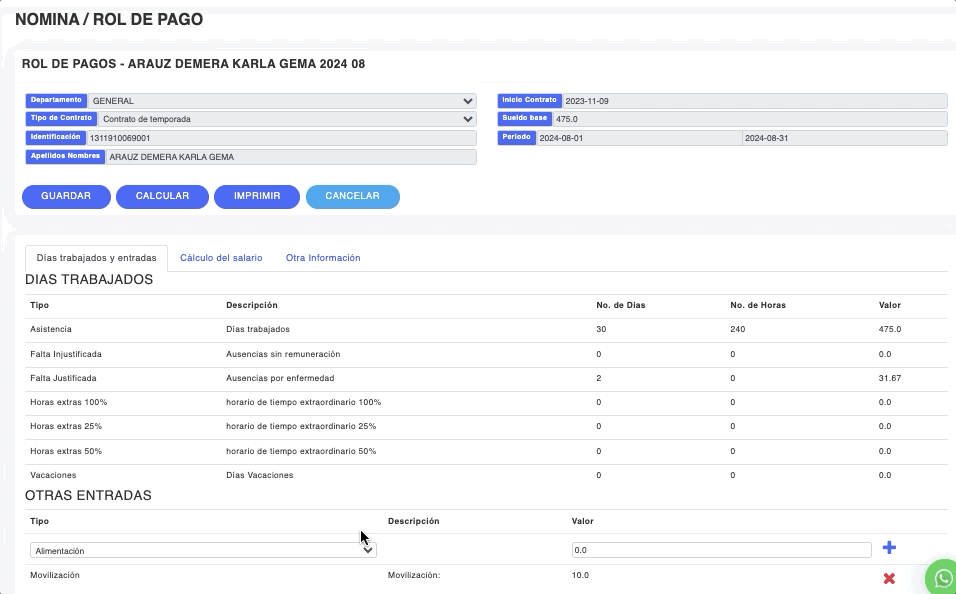 - Si deseas imprimir el rol de pagos del empleado da clic en el botón IMPRIMIR