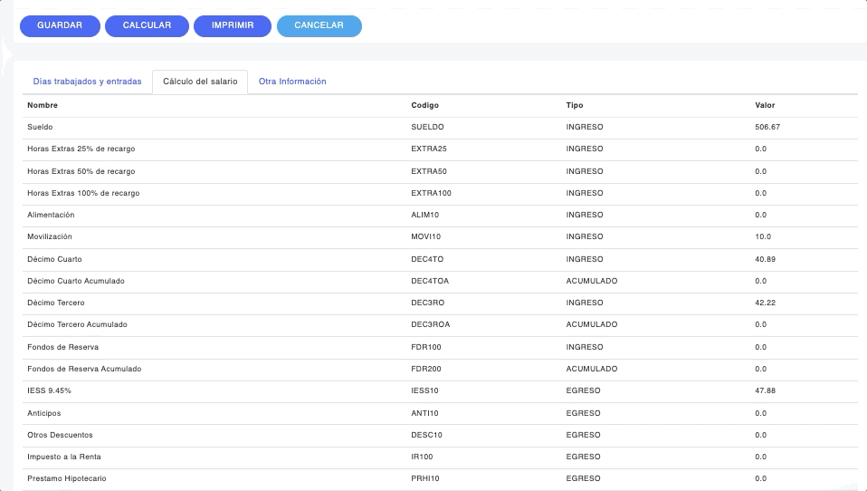 Se despliega automáticamente la información cargada para el rol de pagos del empleado.