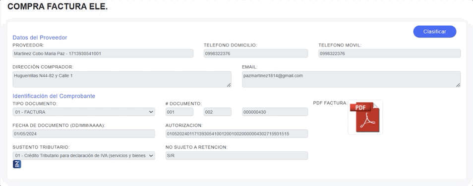 Nota: al reclasificar una factura de compra, si mantienes una retención emitida a esa factura, el sustento ya no es editable; si deseas cambiar el sustento tributario, se deberá anular la retención.