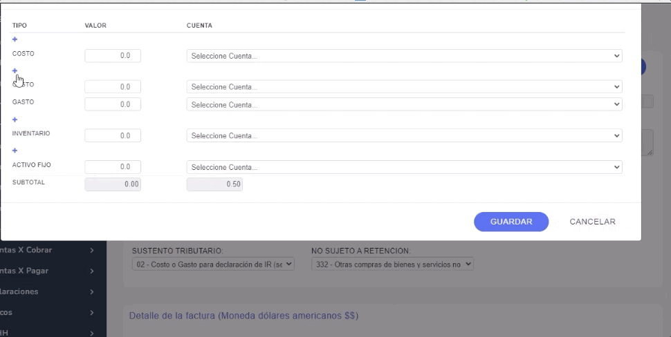 En TIPO – GASTO se coloca el porcentaje de los dos tipos de cuenta de gasto. Esto completa el subtotal, que debe cuadrar con el subtotal de la factura.