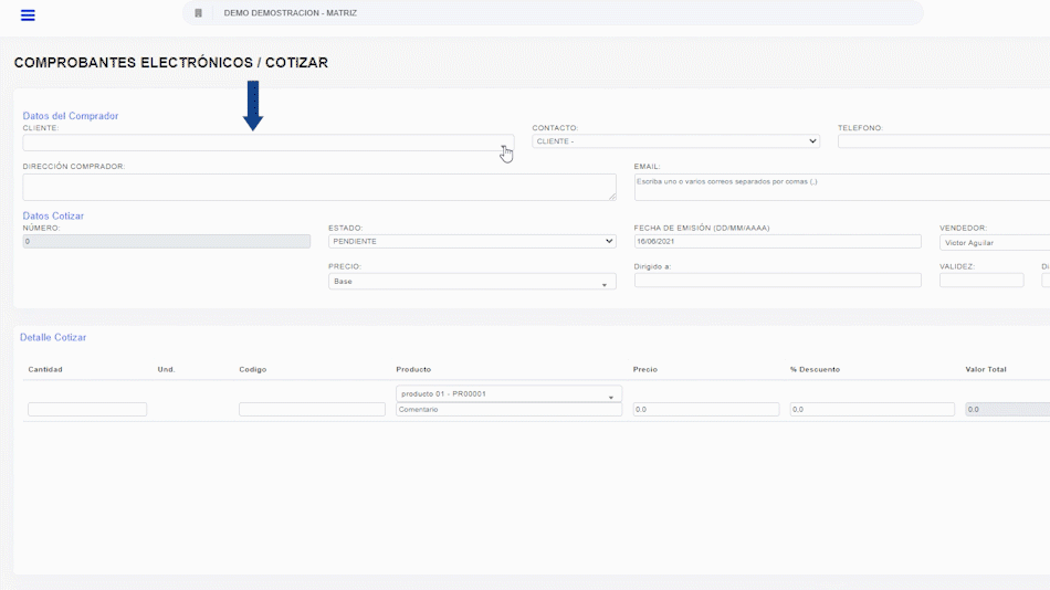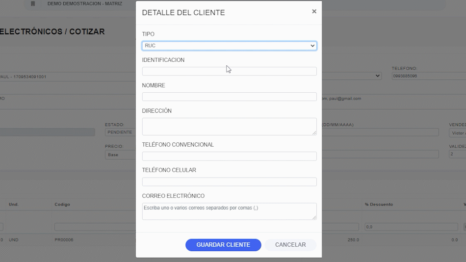 Se despliega a PANTALLA DE COTIZACION donde tienes que escoger un cliente ya creado o crear uno nuevo.