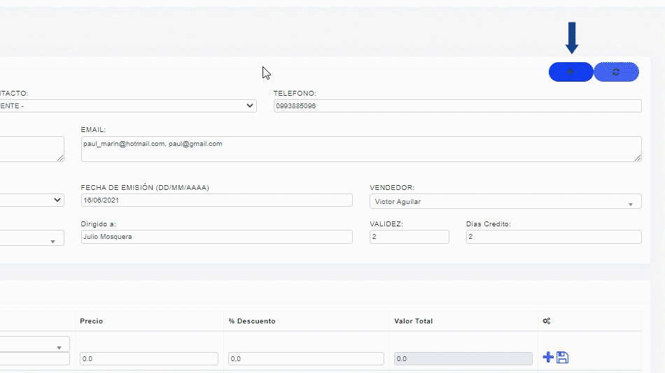 Ingresa los datos del VENDEDOR, VALIDEZ DE LA COTIZACION Y DÍAS DE CREDITO Y DIRIGIDO A para especificar el nombre de la persona a la cual diriges la cotización.