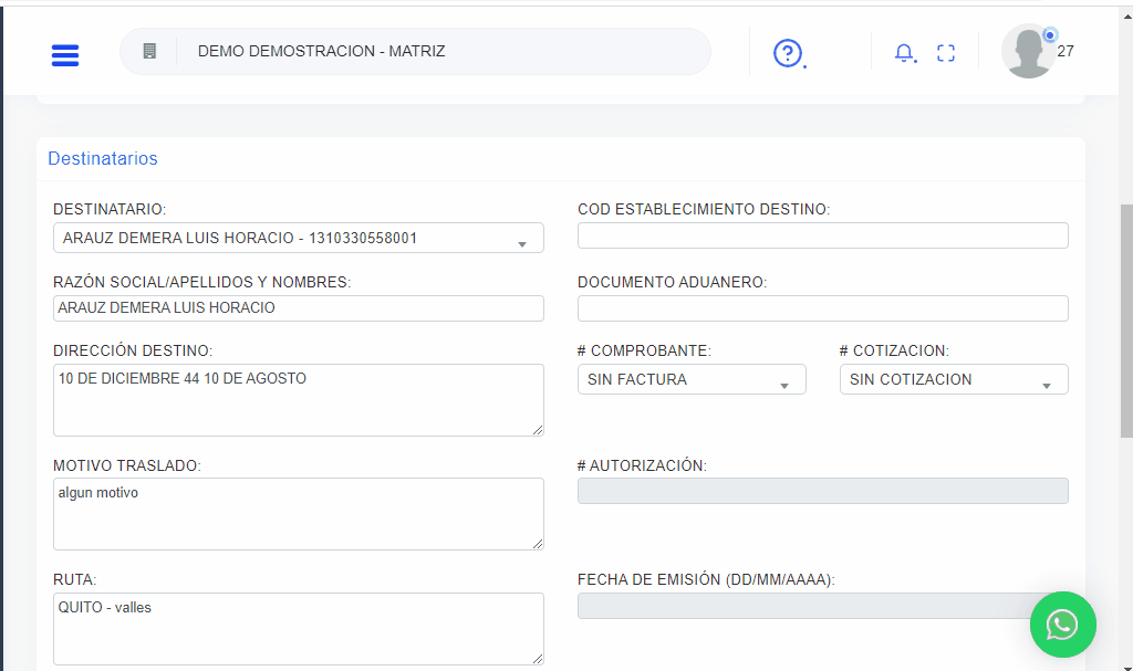 Escoge el nombre del destinatario, los datos aparecerán automáticamente. Comprueba el nombre, ingresa el destino, el motivo del traslado y la ruta.